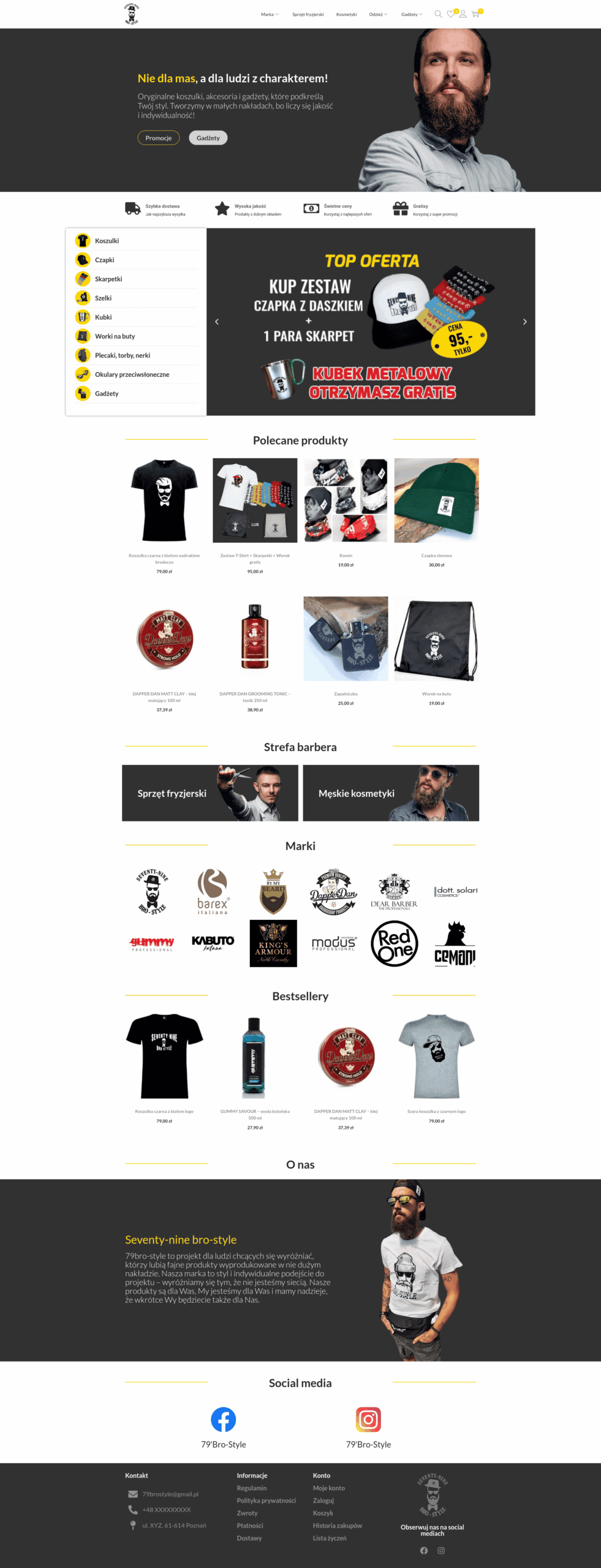 Stworzyłam kompletny projekt graficzny oraz wkrótce działający sklep internetowy na WordPressie, z wykorzystaniem WooCommerce i Elementora. Został on stworzony dla producenta odzieży i akcesoriów w klimacie barberskim.